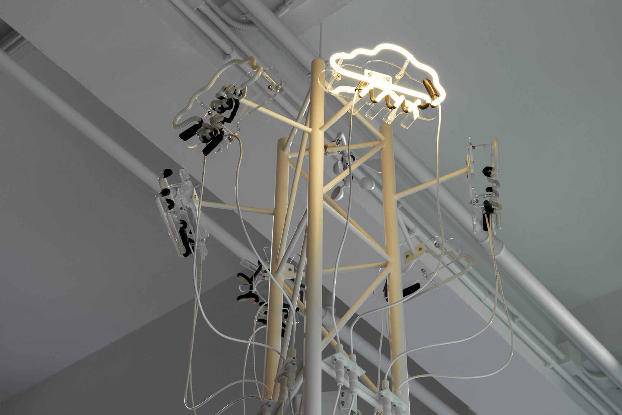 Screens, customised blockchain network, customised software, customised circuits, neon lights, computers, Raspberry Pi, steel frames