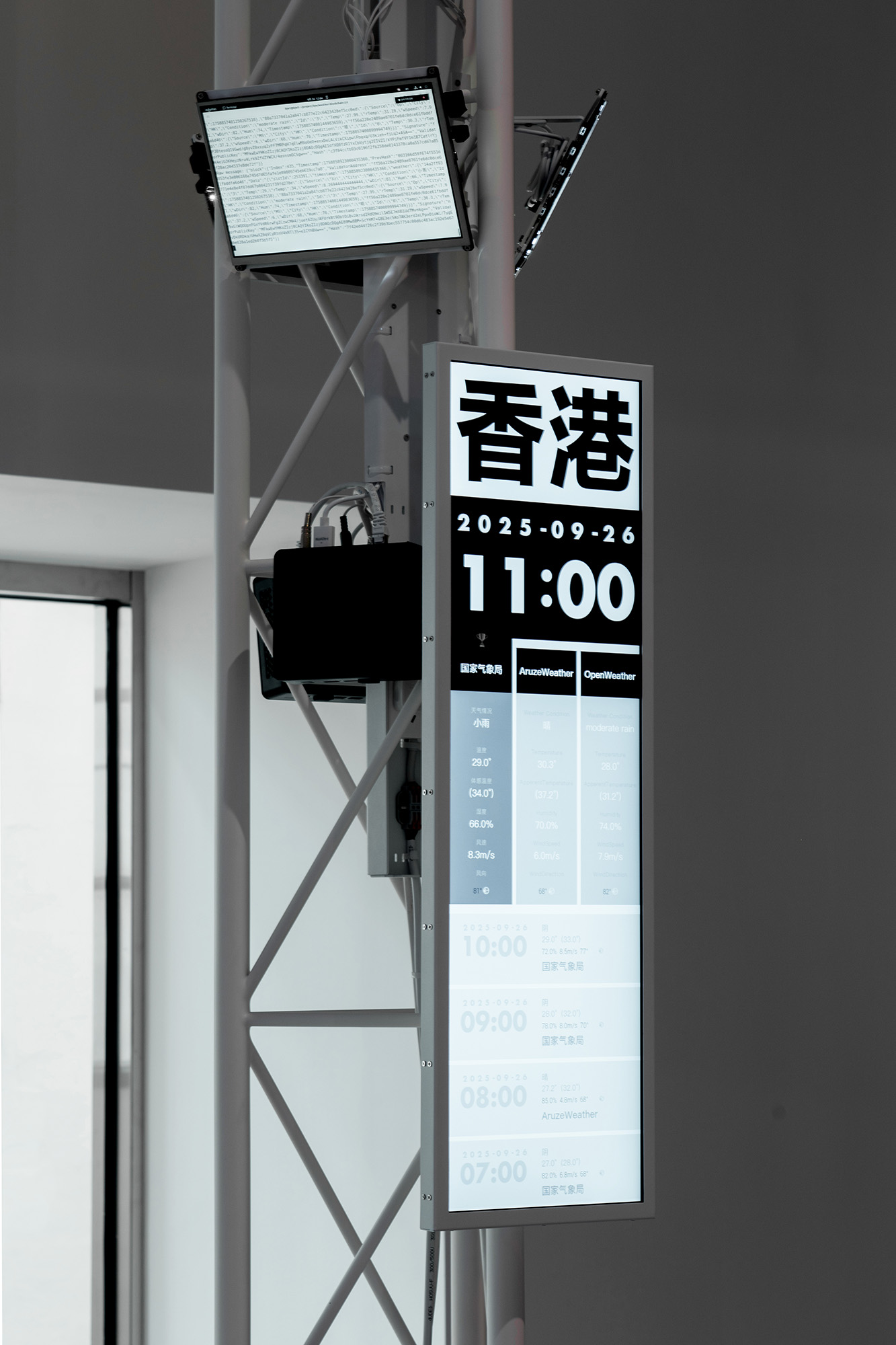区块链从技术结构上来说可被看作一个分布式“账本”,通过其网络中不同节点间的共识来记录数据,具有难以被篡改的特点。气象数据是一种不可复验的时间性数据,利用区块链对于气象数据进行记录,可被看作一种无法证伪的历史书写。近年来国内有多起关于气象数据的争议事件。如2012年美国驻京大使馆开始发布自测的空气质量数据,曾由于其发布的数据与官方相悖而引起广泛关注与讨论。2022夏天的持续高温中,手机天气app中显示的极端高温多次被官方辟谣。此外由于高温津贴引起的劳务纠纷每年也常有发生。装置“天气块报”使用几台硬件条件一致的设备作为节点构建私有链,每个节点负责读取不同的气象数据源,节点间利用PoW共识机制生成区块,并争取记录在区块链数据库中的权力,并播报其记录结果。此作品尝试检视与讨论区块链去中心化结构所带来的公平与信任,与其和来自真实世界的或带有偏见的数据相连接时所引发的矛盾,及其可能带来的对数据强权的推波助澜等不可预期的后果。