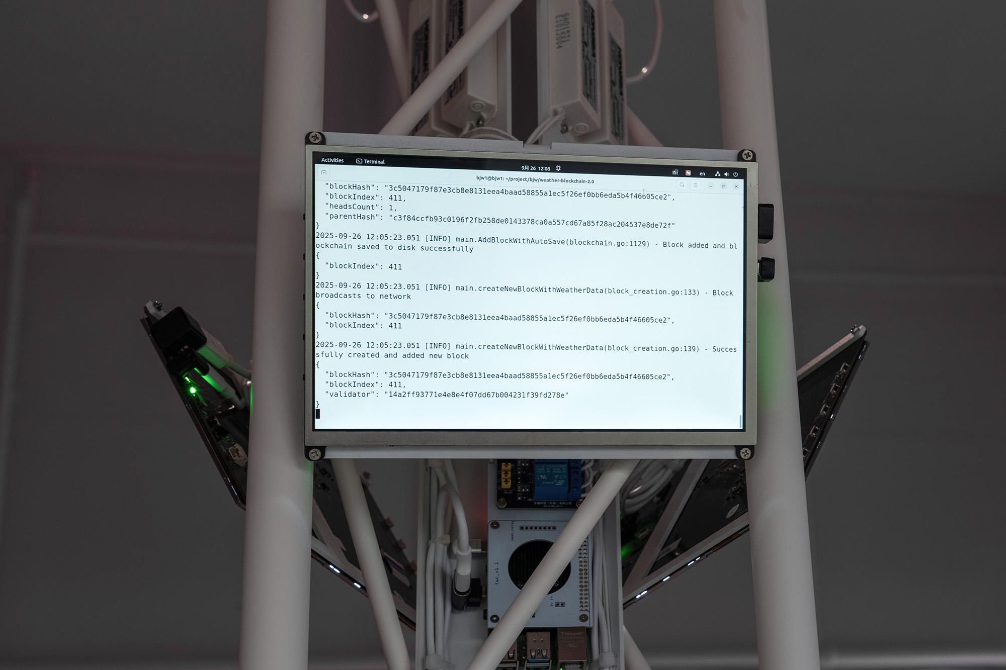 In terms of its technical structure, the blockchain can be observed as a distributed “ledger” in which data is recorded by consensus at different nodes on a network and is fundamentally tamper-proof. Climatic data is a form of temporal data that cannot be re-validated once obtained. As a result, applying the blockchain to record climatic data can be seen as a means to truthfully write history. Various incidents regarding climatic data disputes have occurred in China over the past few years. For instance, the air pollution index self-measured and published by the United States Embassy in Beijing instigated a public discussion and widespread concern in 2021, as it contradicted the official Chinese data; during the long heatwave in the summer of 2022, extreme temperatures reported on mobile apps were refuted by the local government multiple times; meanwhile, labor disputes while working under high temperatures occur frequently each year. The installation entitled The Weather Consensus builds a private blockchain using devices with identical hardware conditions, such as nodes, each responsible for obtaining information from different climatic data sources. Blocks are generated between nodes under the PoW consensus mechanism as they seize the power that is recorded in the blockchain database, the results of which are then broadcast. This artwork attempts to examine and discuss justice and trust enabled by the decentralized structure of the blockchain, as well as the paradox engendered by the connection between the blockchain and data from the real world or skewed by bias, and the unpredictable consequences it might induce such as the reinforcement of data hegemony, among many others.